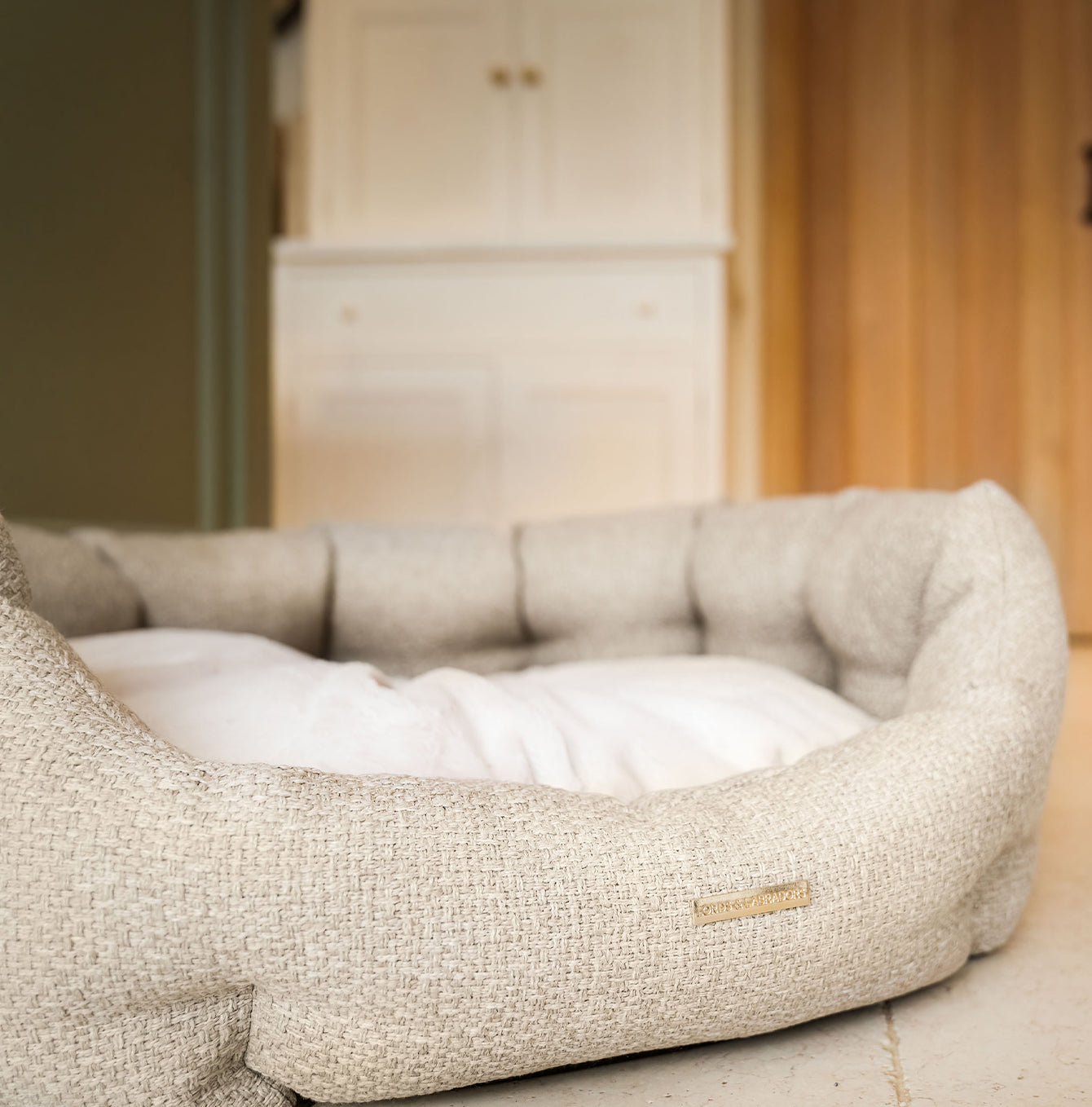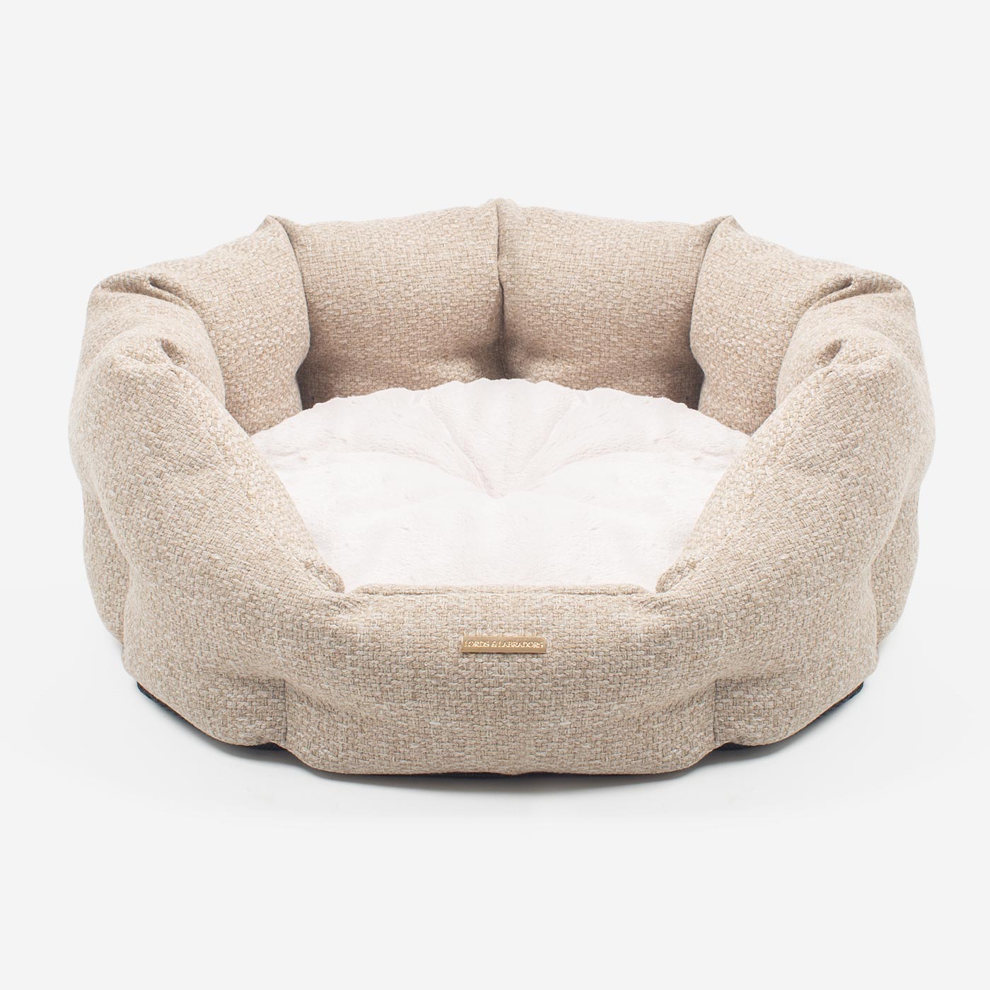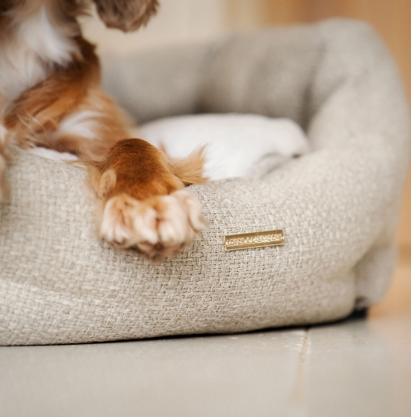 Curl up in comfort with the Lords & Labradors Essentials Herdwick Oval Bed! Featuring a luxe sandstone color that'll fit right in with your home decor and a plush reversible cushion so you can mix up your snuggle game in a jiffy. Plus, the soft sides are perfect for pups who love to rest their head and get cosy. Talk about your dream bed! Handcrafted in Italy, this bed is paws-down the best in pup pet-reclining.