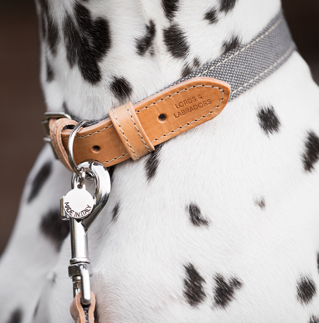 Lead your pup in stylish flair with our Lords & Labradors Essentials Twill Dog Lead Slate! Hand crafted in Italy, this fashionable lead is made of durable canvas fabric and Italian leather accents. The hanging charm featuring the L&L logo and silver hardware give an extra special touch. Stroll with confidence knowing that a strong clip attaches securely to any collar.