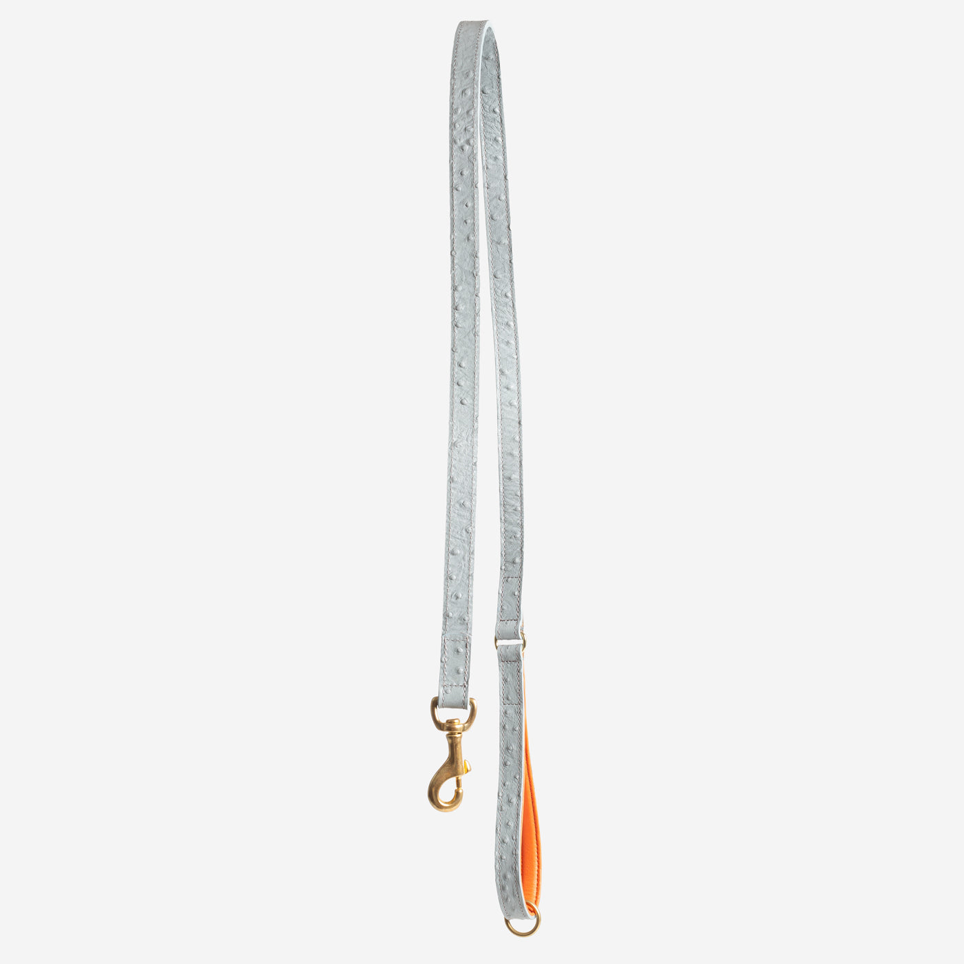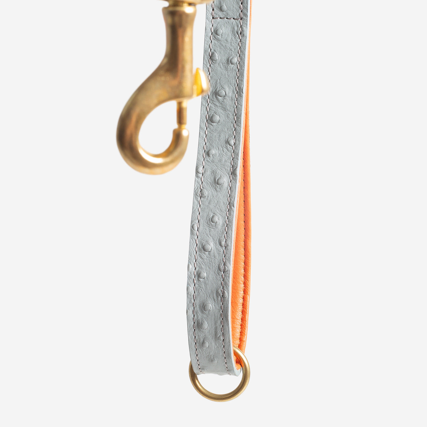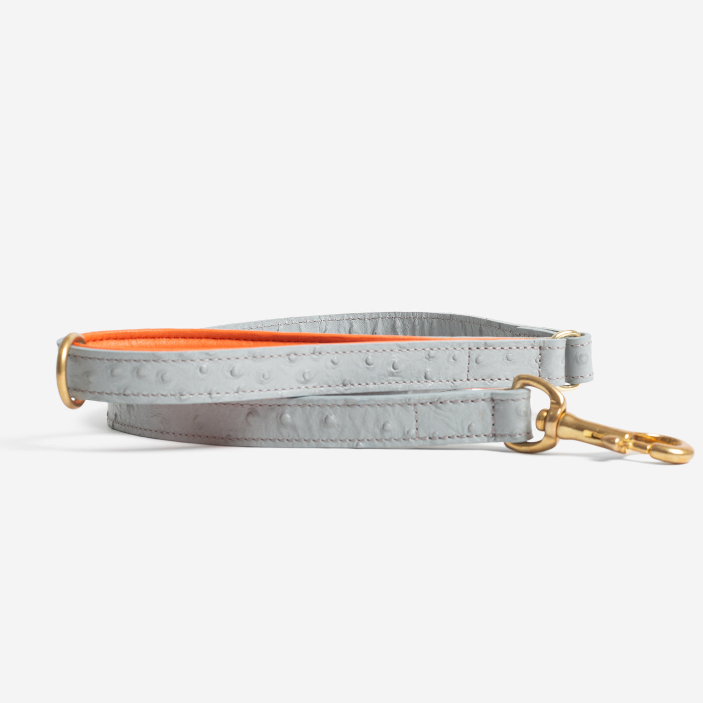 Our Ostrich Leather Dog Lead in Grey & Orange give your pup the royal treatment. Handcrafted from luxurious real leather, embossed with an Ostrich inspired print for the ultimate luxurious look. It's the perfect lead to make 'em feel like royalty on their daily walks. Plus, it comes in three divine colour choices and two convenient sizes – fit for a king (or queen) dog!