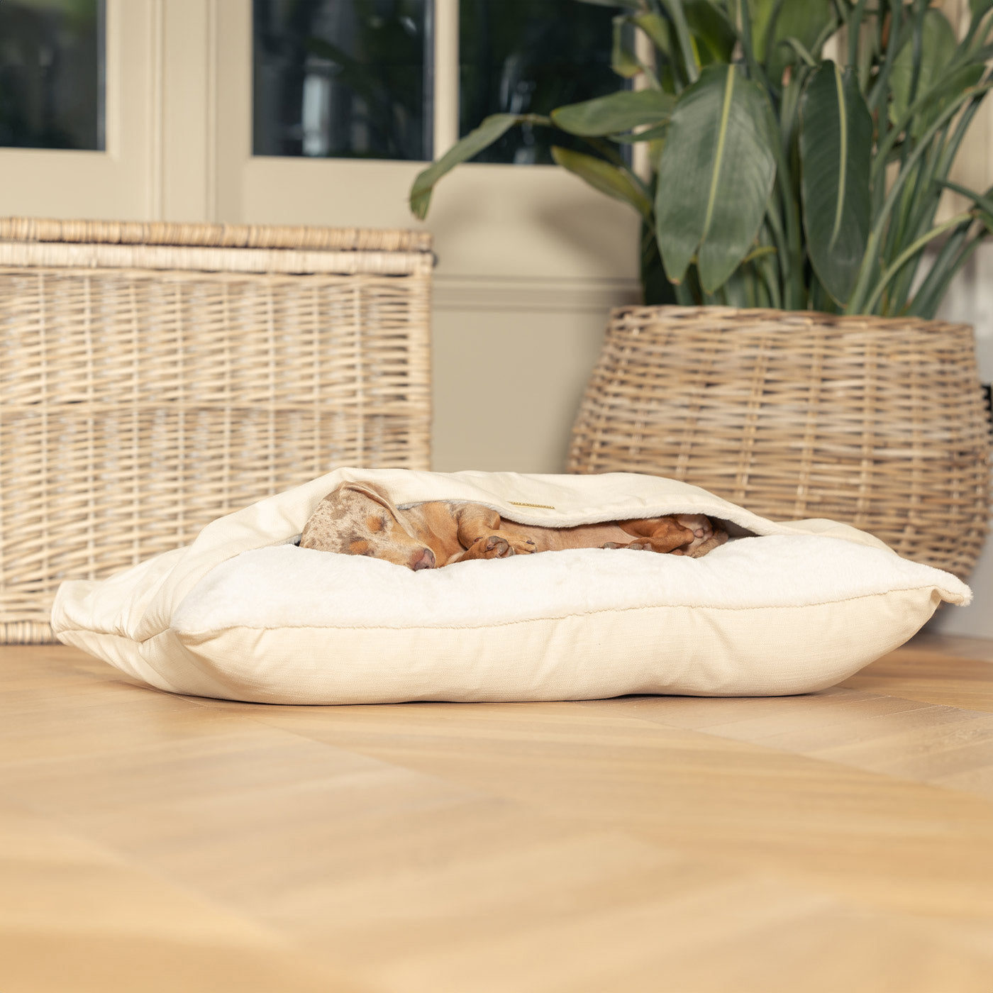 Comfort your canine companion with the Lords & Labradors Sleepy Burrows Bed in Savanna Bone. This cozy bed offers a luxurious home for your pet to curl up in, featuring a plush, soft inner fabric complemented by a neutral Savanna Bone outer fabric, as well as a removable cover for simple cleaning. Not only that, but it can also be used as a pillow, or your pet can snuggle underneath the top hood. Finally, it's machine washable at 30 degrees, and it can even be used in matching Lords & Labradors crates.