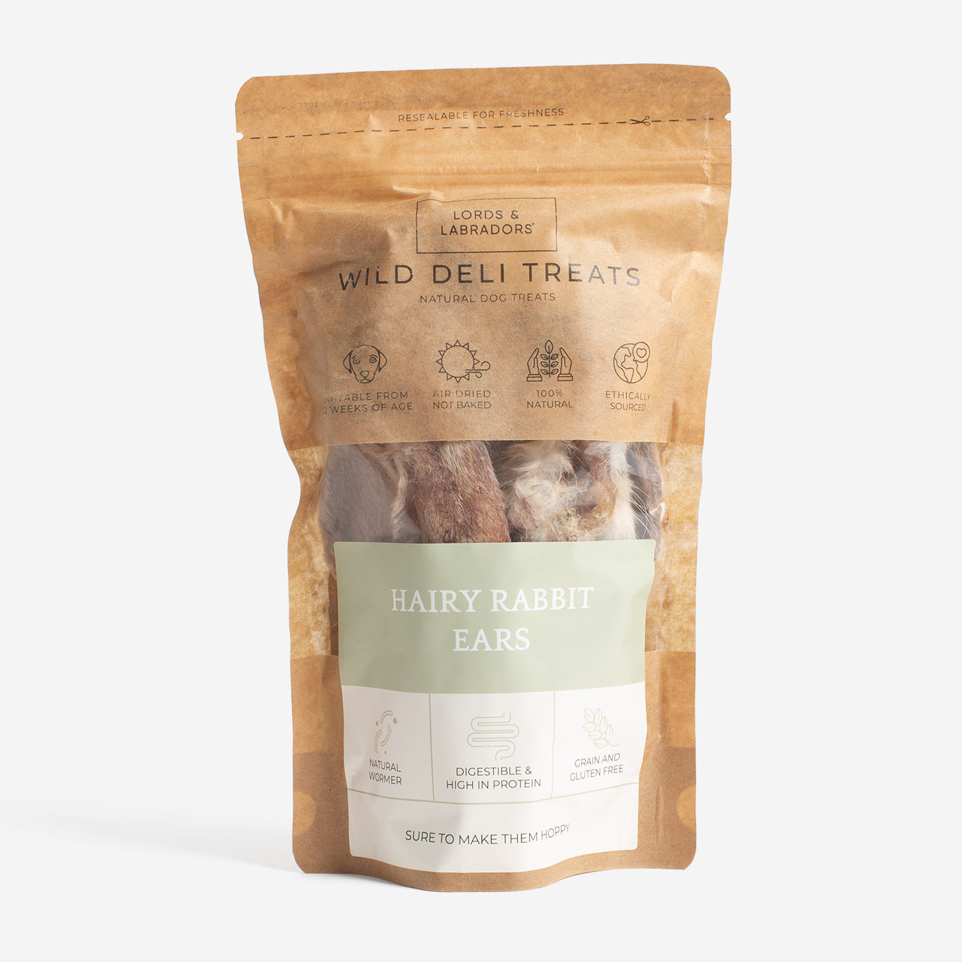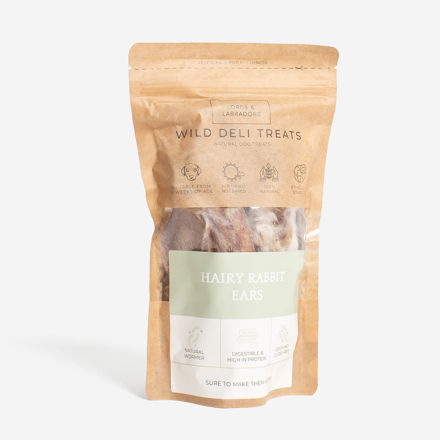 Feed your furry friend the wildest snack around - Lords & Labradors Wild Deli Hairy Rabbit Ears! Air-dried to a crispy crunch, these delicious treats are guaranteed to be 100% nutritious and oh-so-tasty! Plus, they're gluten and grain-free and include natural wormers, so they're as good for your pup as they are delicious! (Your pup won't even know they're eating healthy!) Get your paws on a bag today!