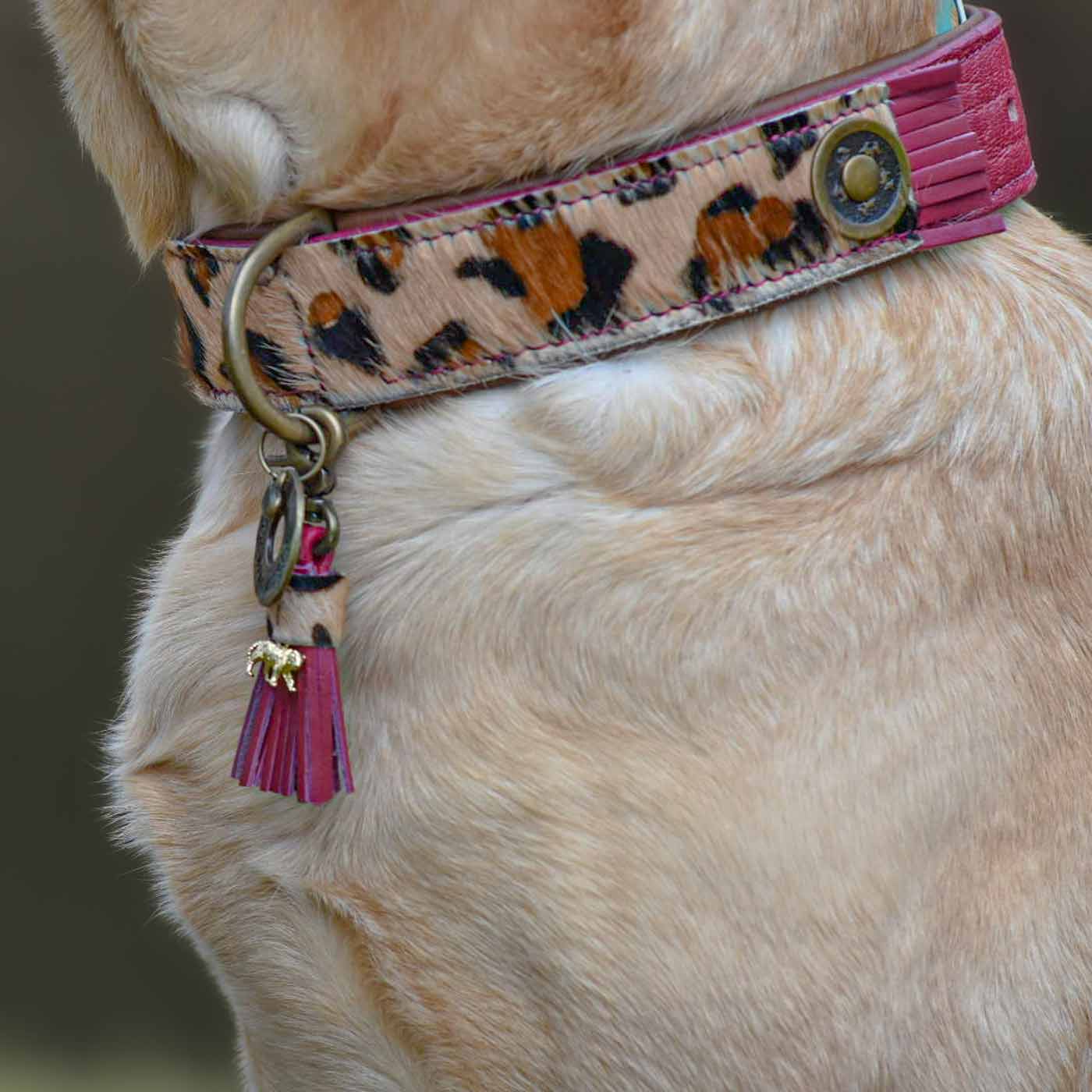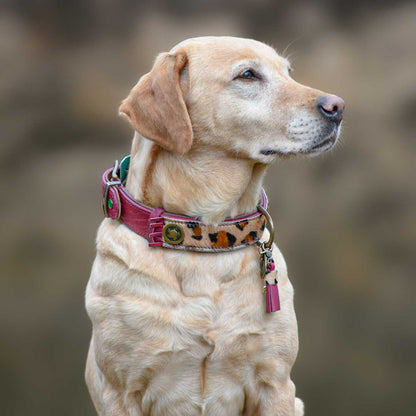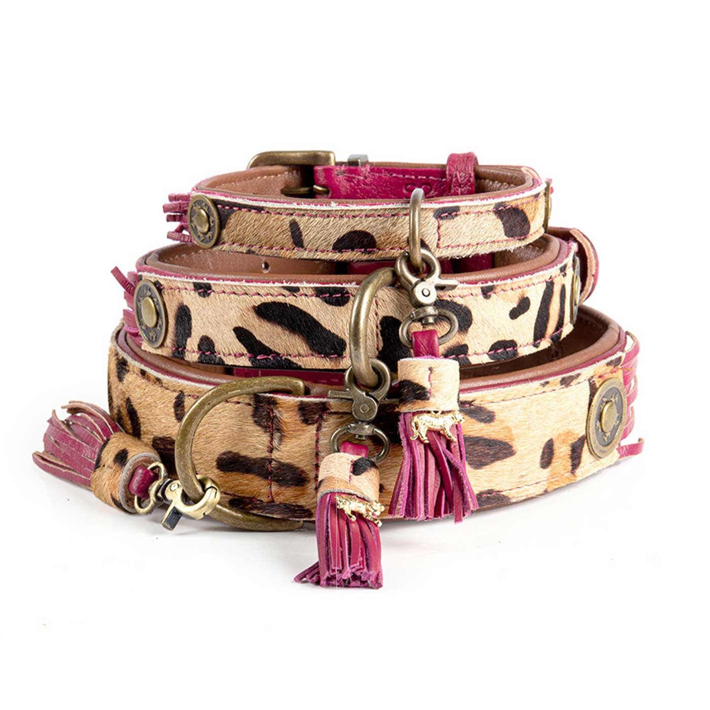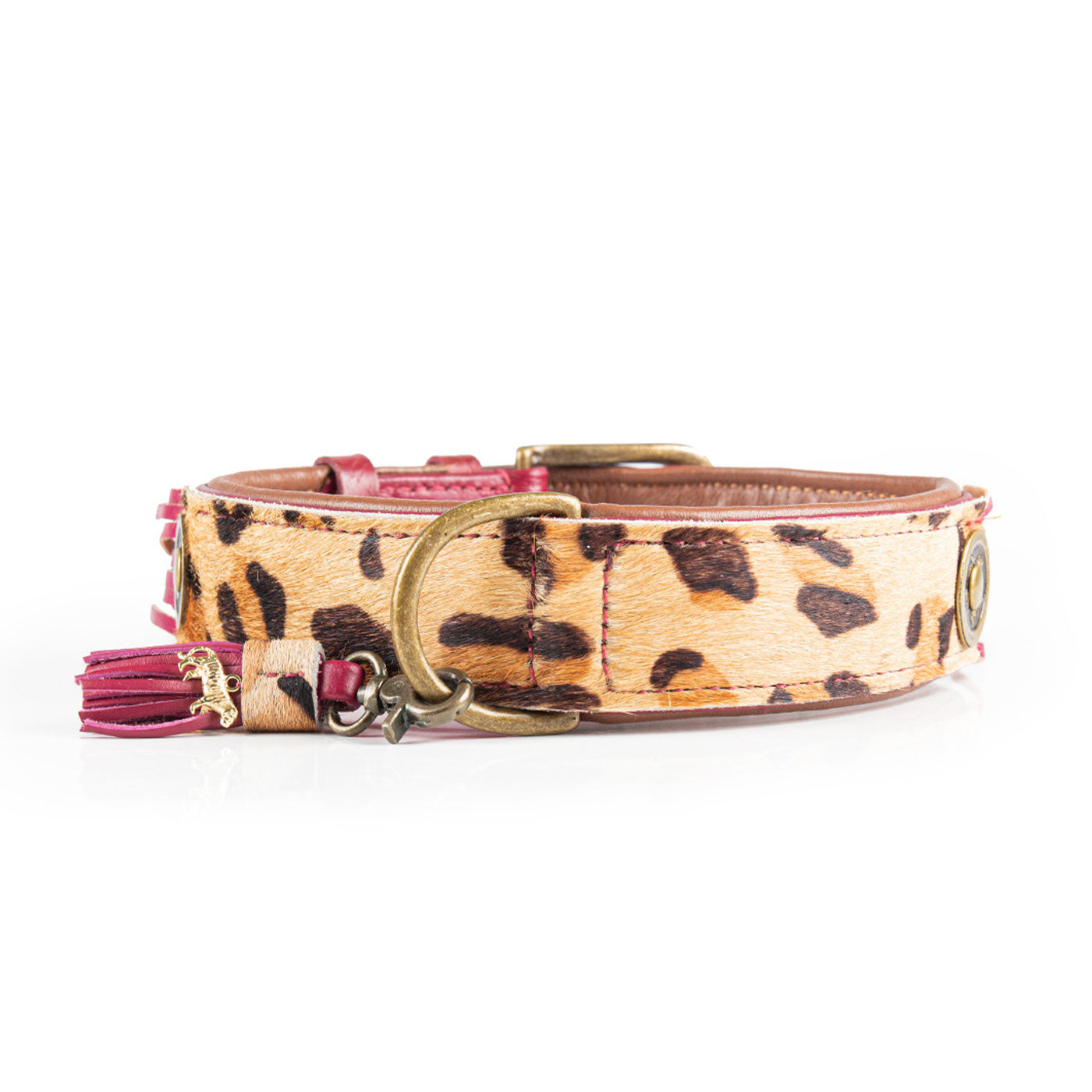 The Lou Lou Dog Collar by DWAM is a beautifully crafted, animal print design collar with pink accents. Made with short fur and detailed, extra-strong stitching, it's both stylish and durable. The sturdy brass hardware and easy loop attachment make it practical too. Available in 7 sizes, from Chihuahuas to Great Danes, complete the set with the matching lead.