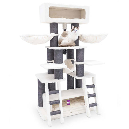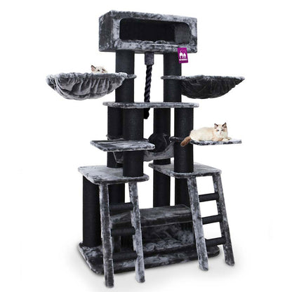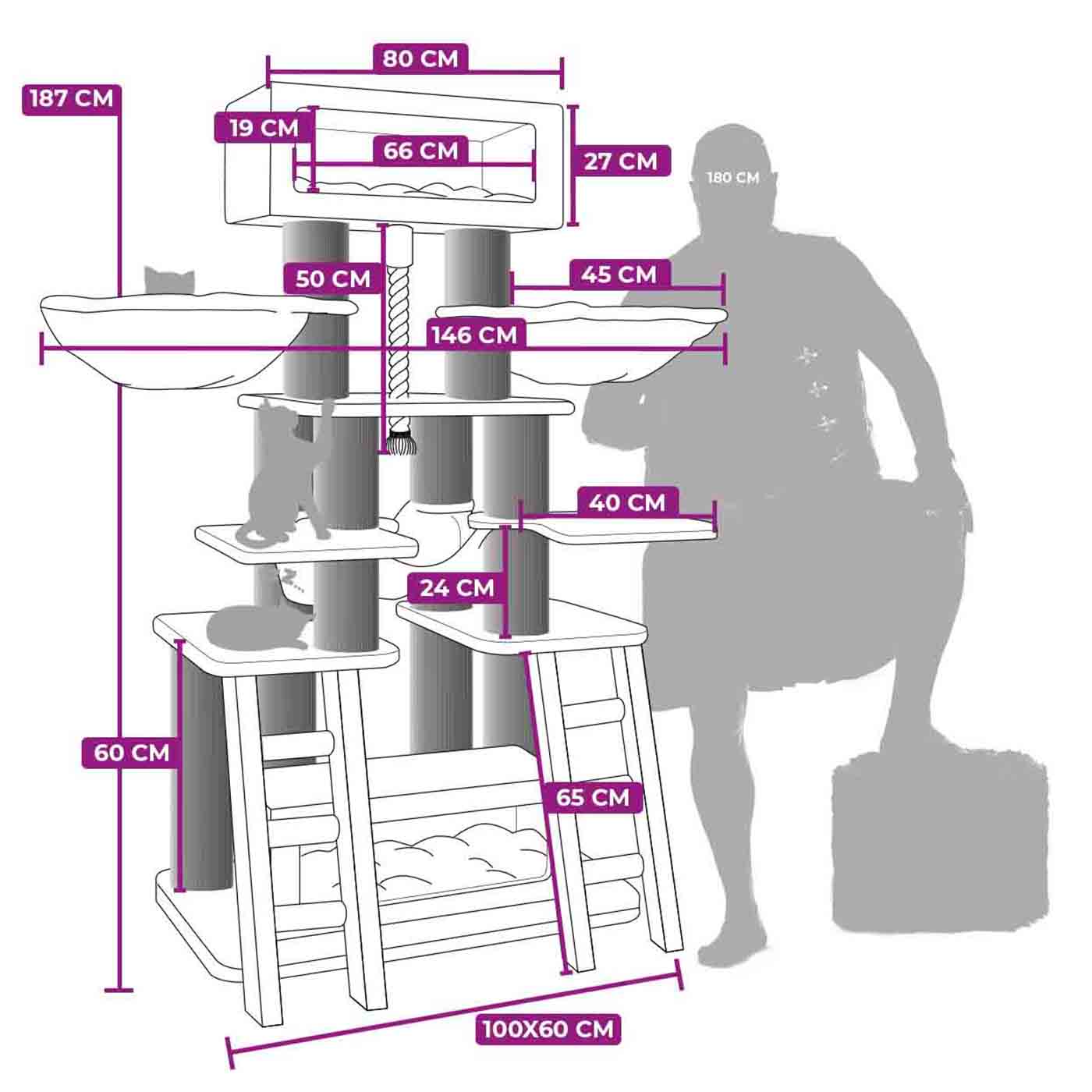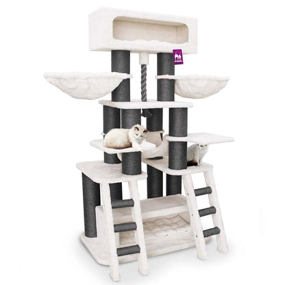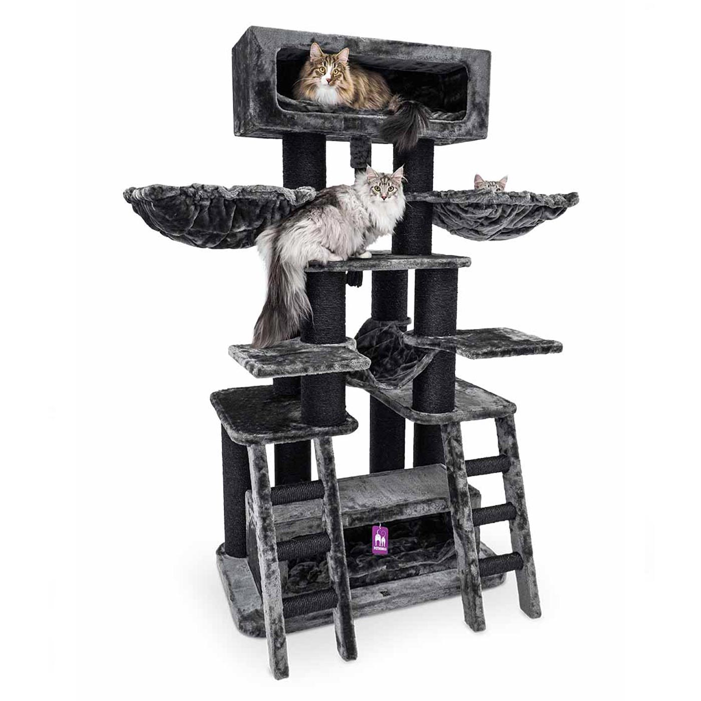 The Lucky Rebels Skybox 187cm Cat Tree has modern shapes and soft cushions, providing lots of cosy sleeping places. Its look out bed at the top is the perfect spot for surveying the landscape. The multiple hammocks and caves offer plenty of rest and relaxation while the steps offer easy access for smaller or elderly cats. It also has 15cm thick posts for scratching, ensuring your cats have the best of both worlds.