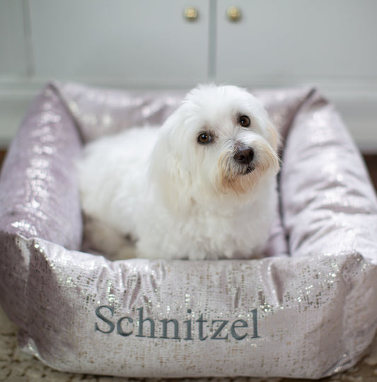 A super stylish dog bed crafted from soft velvet and deeply filled for extra comfort. The velvet colours are divine shades that will look beautiful in any home, whether contemporary or traditional. A timeless addition to your furnishings that, with care, will last for years to come. Your dog will adore lounging and snoozing on their velvet box bed. It's squishy and soft so they can curl up into it and the walled design is ideal for dogs who like to rest their heads when they're relaxing. Available in four sizes, personalisation is also available to add the perfect finishing touch to your dog's new bed.