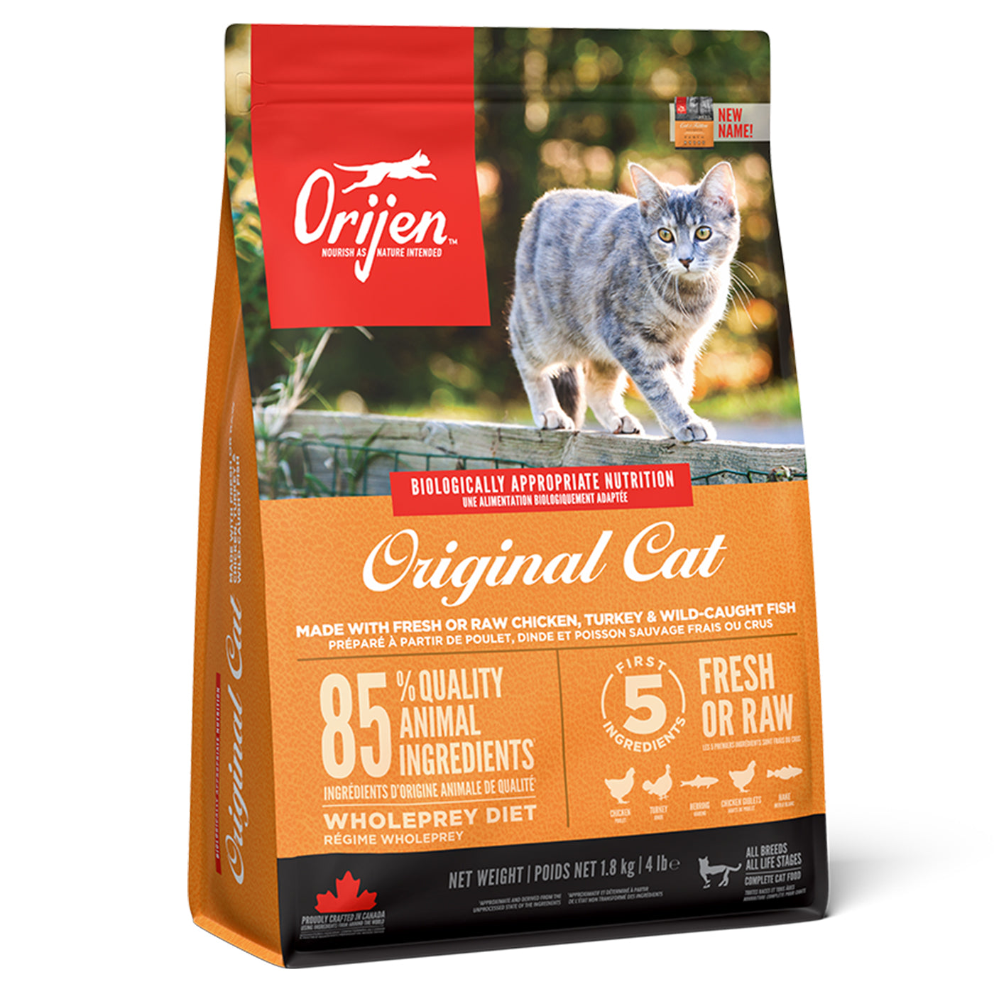 ORIJEN Original Cat diet is made with fresh or raw* chicken, turkey and wild-caught fish. Packed with WholePrey animal ingredients like poultry, fish, organs and bone, ORIJEN Original Cat diet is made with the most nutrient-dense, succulent parts of the prey to deliver the nutrition cats need. With 85%** quality animal ingredients and a freeze-dried liver coating, this diet is beyond comparison. *Our fresh ingredients use refrigeration as the sole method of preservation and our raw ingredients are frozen at the peak of freshness to preserve nutrients. **Approximate and derived from the unprocessed state of the ingredients.