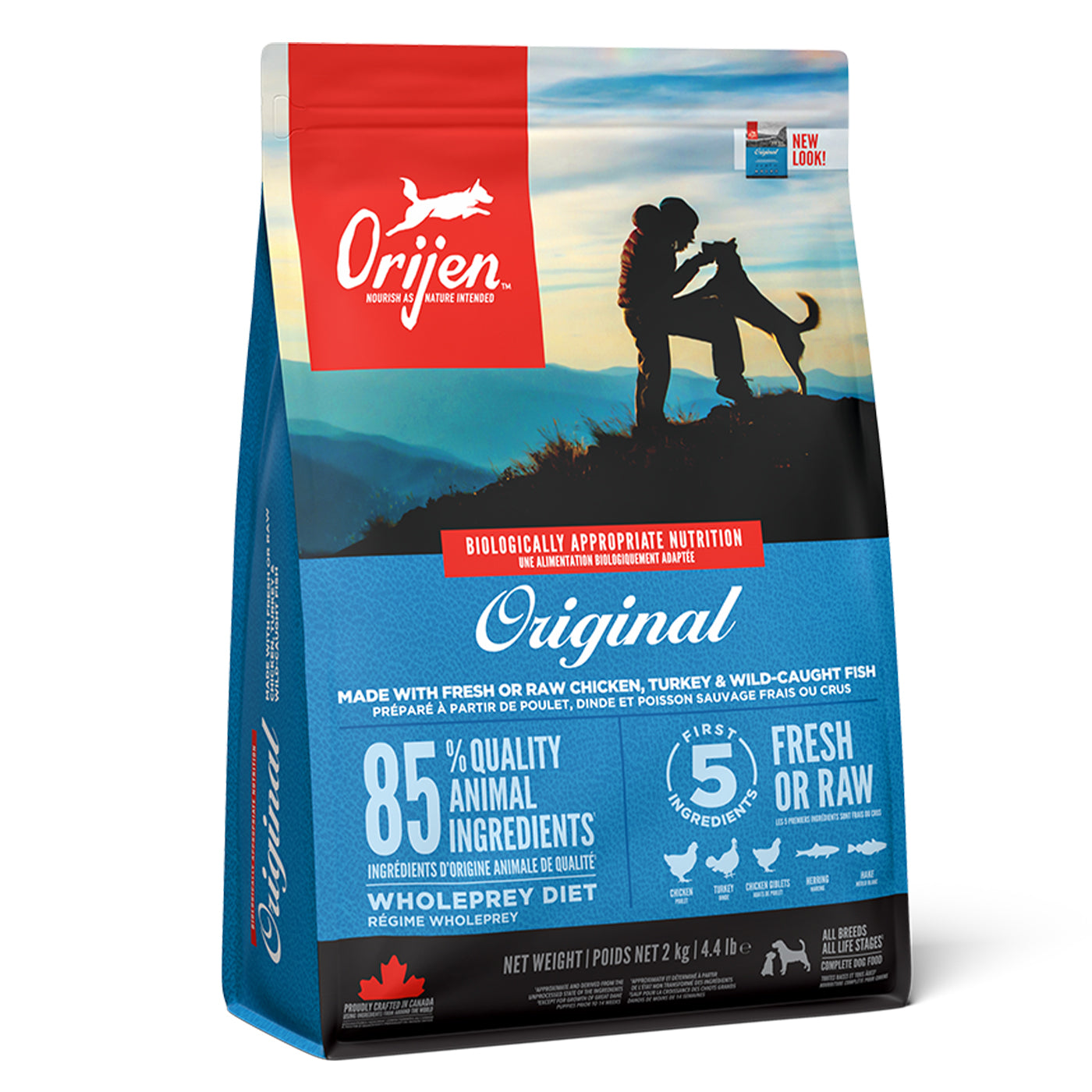 Help your dog thrive with the power of protein-rich recipes that provide peak nourishment. Dogs are ancestral carnivores, so they need a Biologically Appropriate diet rich and varied in whole animal ingredients. ORIJEN Original diet is made with 85%* quality animal ingredients like fresh or raw** chicken and turkey, and wild-caught or sustainably farmed fish. Packed with WholePrey animal ingredients like organs and bone, ORIJEN food is made with the most nutrient dense, succulent parts of the prey to deliver the nutrition dogs need. The result is a diet for your canine companion that is beyond comparison. *Approximate and derived from the unprocessed state of the ingredients. **Our fresh ingredients use refrigeration as the sole method of preservation and our raw ingredients are frozen at the peak of freshness to preserve nutrients.
