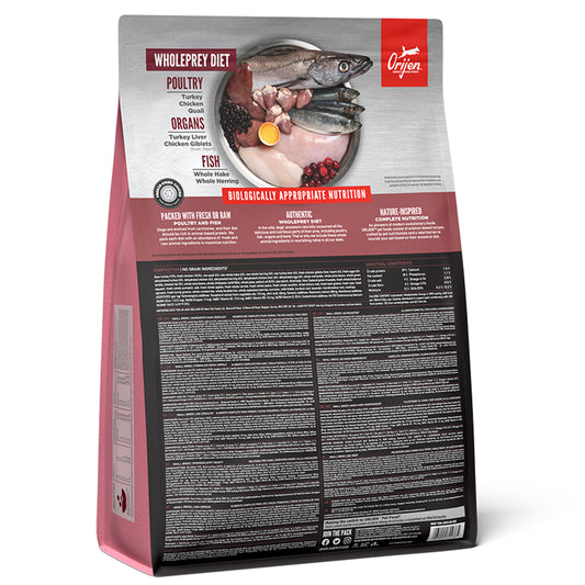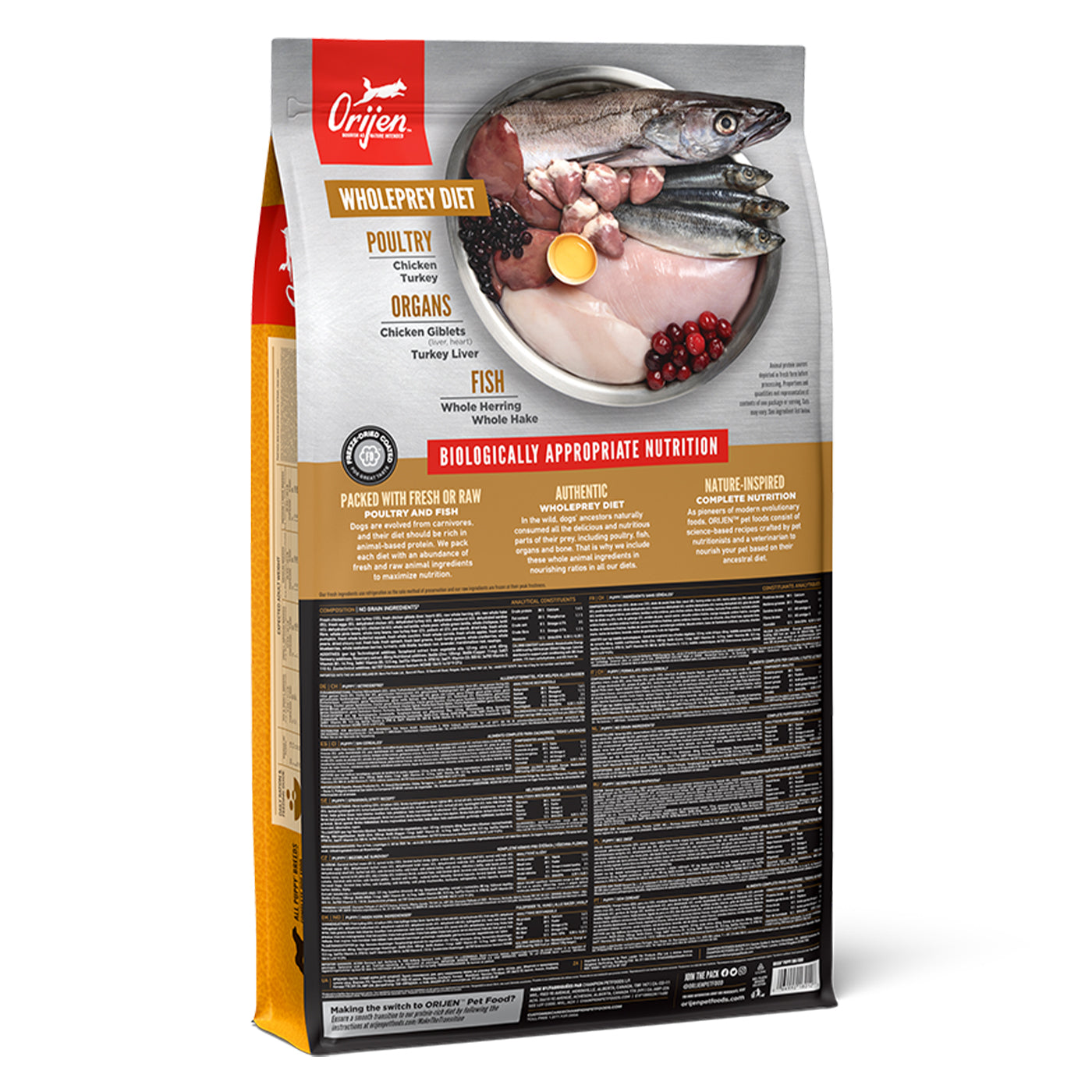 ORIJEN pioneered Biologically Appropriate food and WholePrey nutrition. A biologically appropriate diet mirrors the rich, fresh, variety of WholePrey meats that dogs and cats have evolved to eat. That is why fresh or raw meat*, poultry, fish, and nutrient-rich organs are always the first FIVE ingredients in ORIJEN. ORIJEN is made with 85% quality** animal ingredients, 15% vegetables, fruit and botanicals and 0% grain, potato, tapioca and plant protein concentrates. 2/3 ingredients are fresh or raw* meat organs, cartilage, and bone in natural WholePrey ratios, eliminating the need for long lists of synthetic supplements. ORIJEN is a nutrient dense, complete dog and cat food for amazing health support that helps them thrive for a lifetime. ORIJEN - nourish as nature intended.