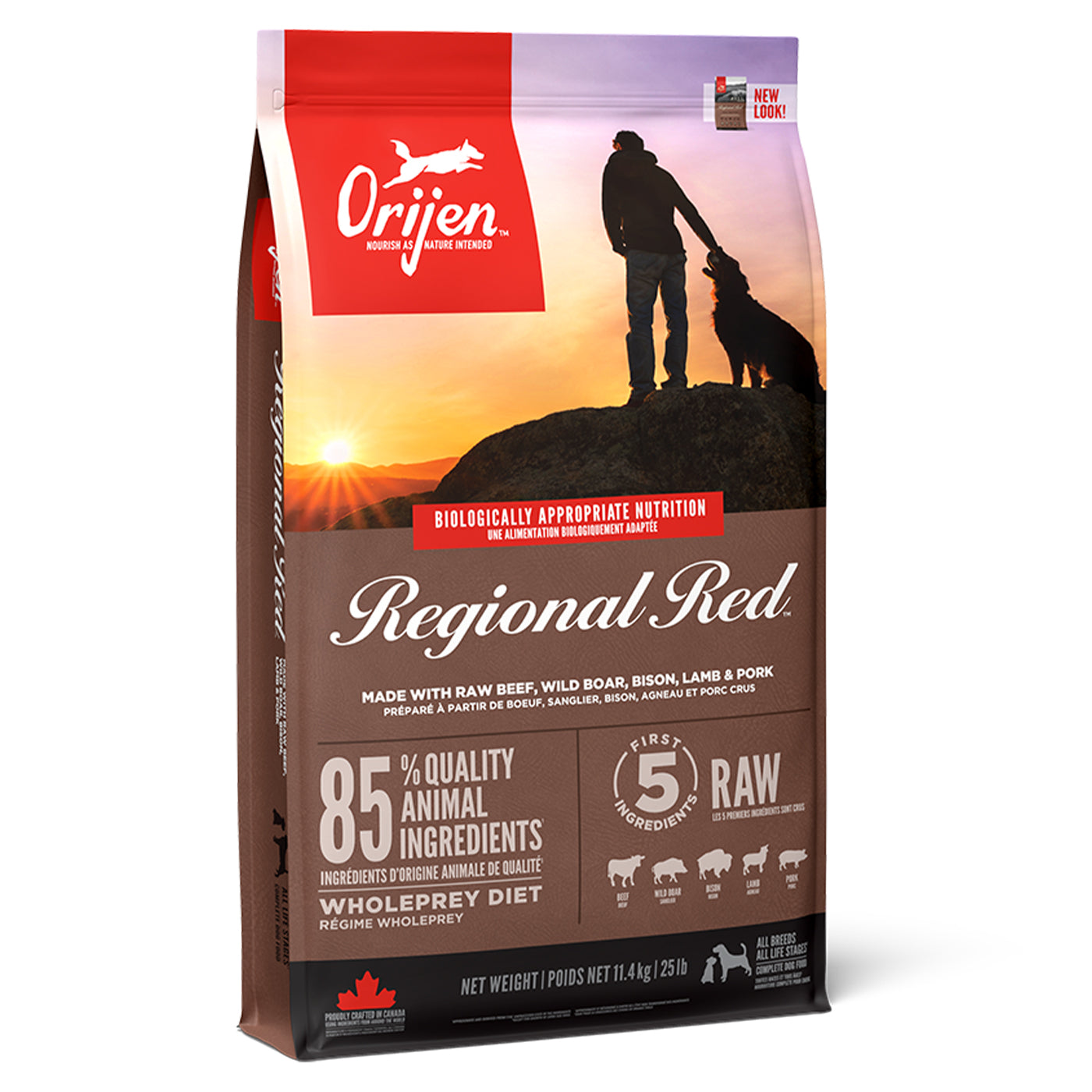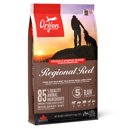Help your dog thrive with the power of protein-rich recipes that provide peak nourishment. Dogs are ancestral carnivores, so they need a Biologically Appropriate diet rich and varied in whole animal ingredients. ORIJEN Regional Red diet is made with 85%* quality animal ingredients like raw** beef, wild boar, bison, lamb and pork. Packed with WholePrey animal ingredients like organs and bone, ORIJEN food is made with the most nutrient-dense, succulent parts of the prey to deliver the nutrition dogs need. The result is a diet for your canine companion that is beyond comparison. *Approximate and derived from the unprocessed state of the ingredients. **Our fresh ingredients use refrigeration as the sole method of preservation and our raw ingredients are frozen at the peak of freshness to preserve nutrients.