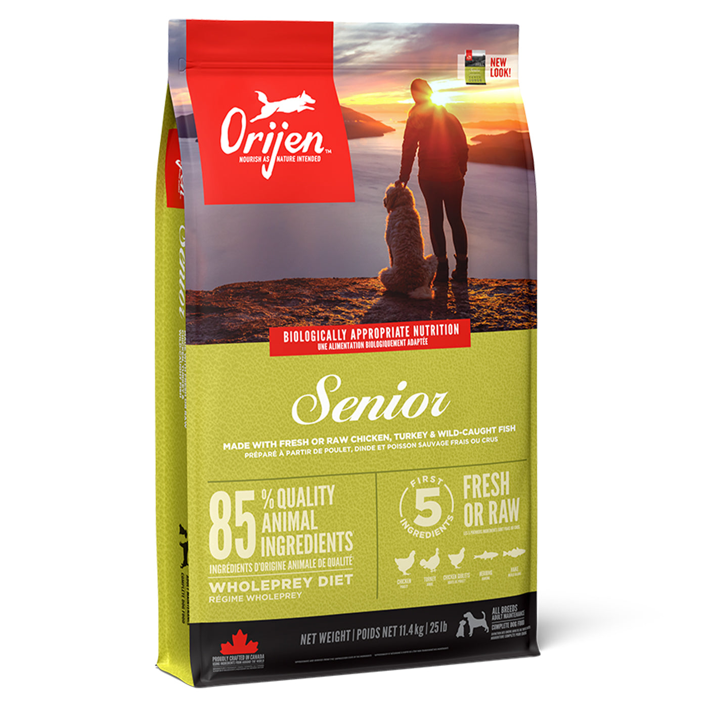 Help your dog thrive with the power of protein-rich recipes that provide peak nourishment. Dogs are ancestral carnivores, so they need a Biologically Appropriate diet rich and varied in whole animal ingredients. ORIJEN Senior diet is crafted specifically for your senior dog to help them stay healthy by supporting lean muscle mass and weight maintenance. Packed with WholePrey animal ingredients like organs and bone, ORIJEN food is made with the most nutrient-dense, succulent parts of the prey to deliver the nutrition dogs need. With 85%* quality animal ingredients and a freeze-dried liver coating, this diet is beyond comparison. *Approximate and derived from the unprocessed state of the ingredients.
