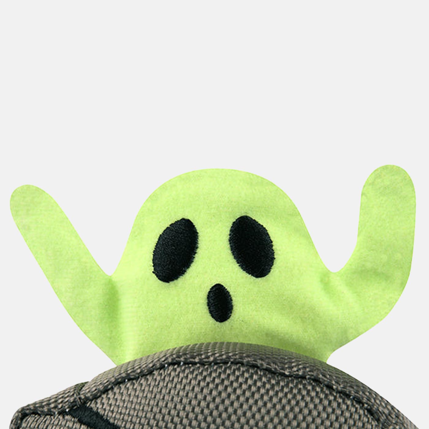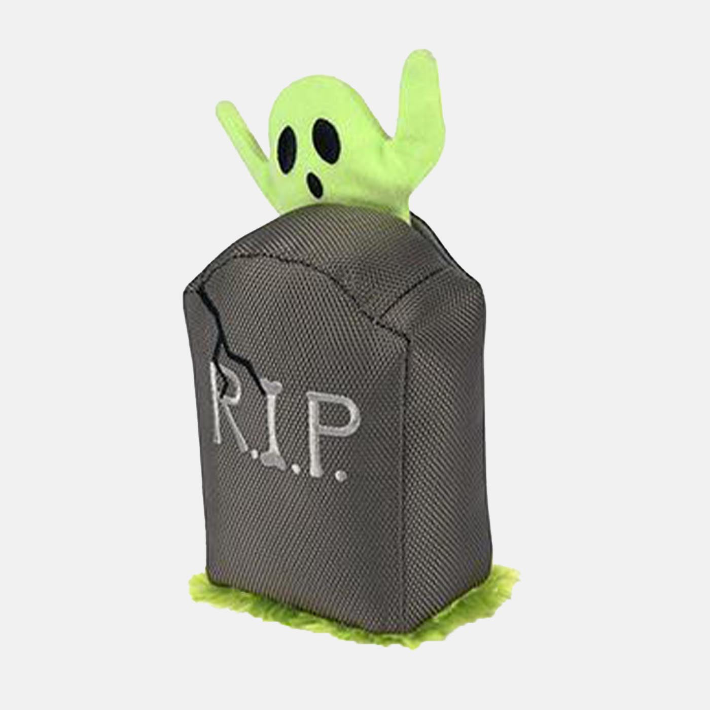 Add some spookiness to playtime with the P.L.A.Y. Howling Haunts Ghoulish Grave. This grave stone toy features a glow in the dark ghost and crinkles for extra fun. Plus, it's machine washable and made from 100% safe recycled plastic bottles. No tricks, just treats for your furry friend!