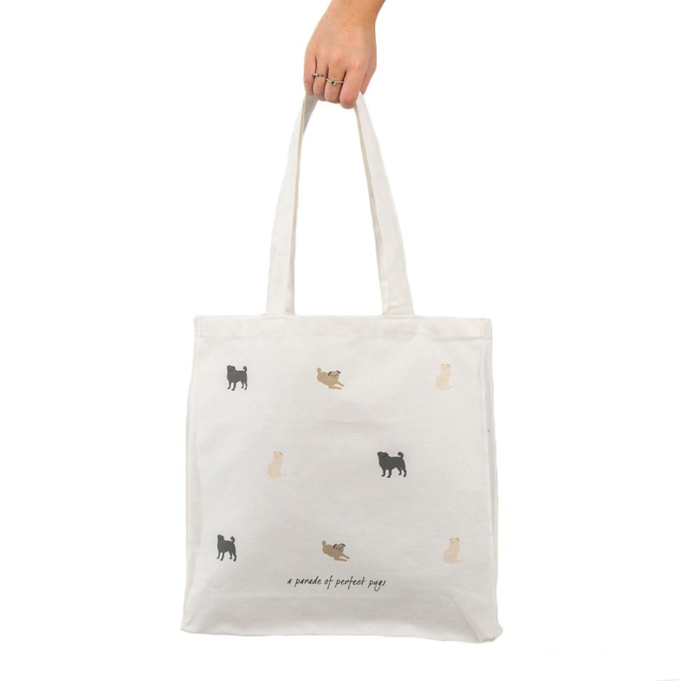 The Perfect Pugs Canvas Tote Bag is the perfect bag for the Pug owner! Whether you have a Pug, want one or just love them this bag is a must have. Adorned with a subtle silhouette print in Farrow and Ball inspired colours it is simple and elegant. Use it as a shopping tote, a book bag or just to tote your everyday essentials . Featuring a deep gusset for extra space it also has two long top handles enabling it to be carried comfortably on the shoulder. Also available are the matching apron, tea towel, double oven glove and mug.