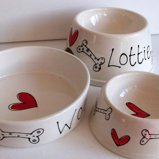 A beautiful, personalised dog bowl with a hand-painted design. Lovingly handcrafted and painted, these dog bowls have been glazed and kiln-fired to give a long-lasting finish. The bowls have straight sides and are perfect for water as well as being dishwasher safe. There are two sizes available so you can pick a size to suit your pet and needs.
