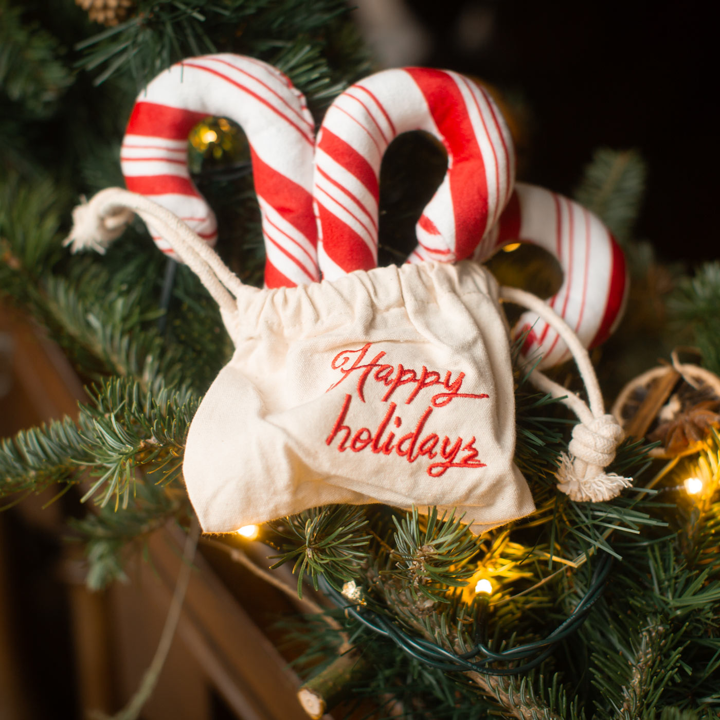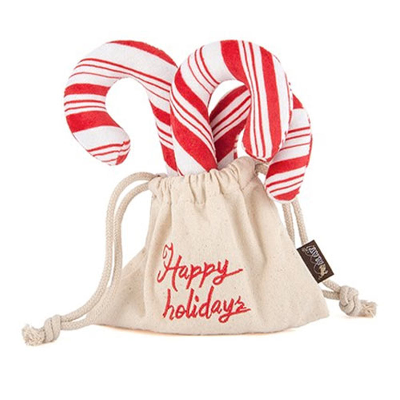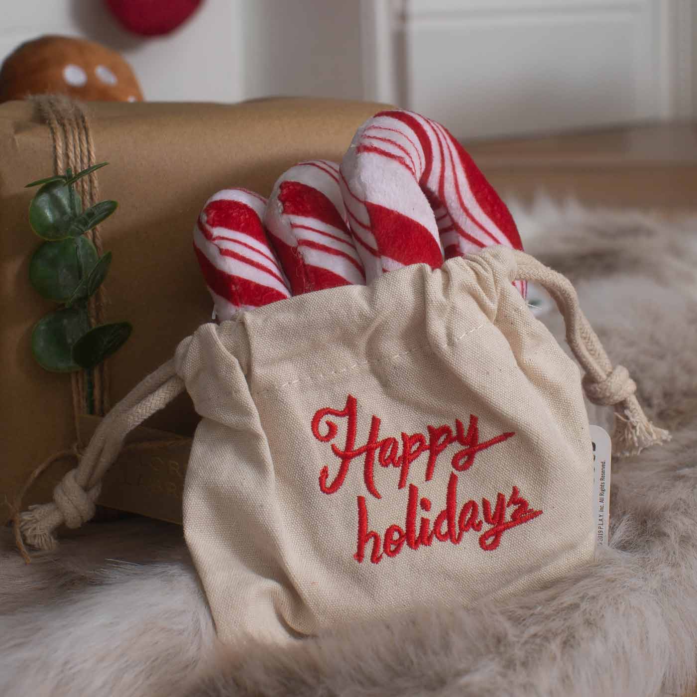 This holiday season, reward your furry friend with P.L.A.Y.'s Christmas Candy Canes! Three candy canes are tucked inside a cute, festive bag and each candy is equipped with a squeaker for added fun. The toy is made with eco-friendly stuffing made from recycled plastic bottles and is easily machine washable and dryer friendly.