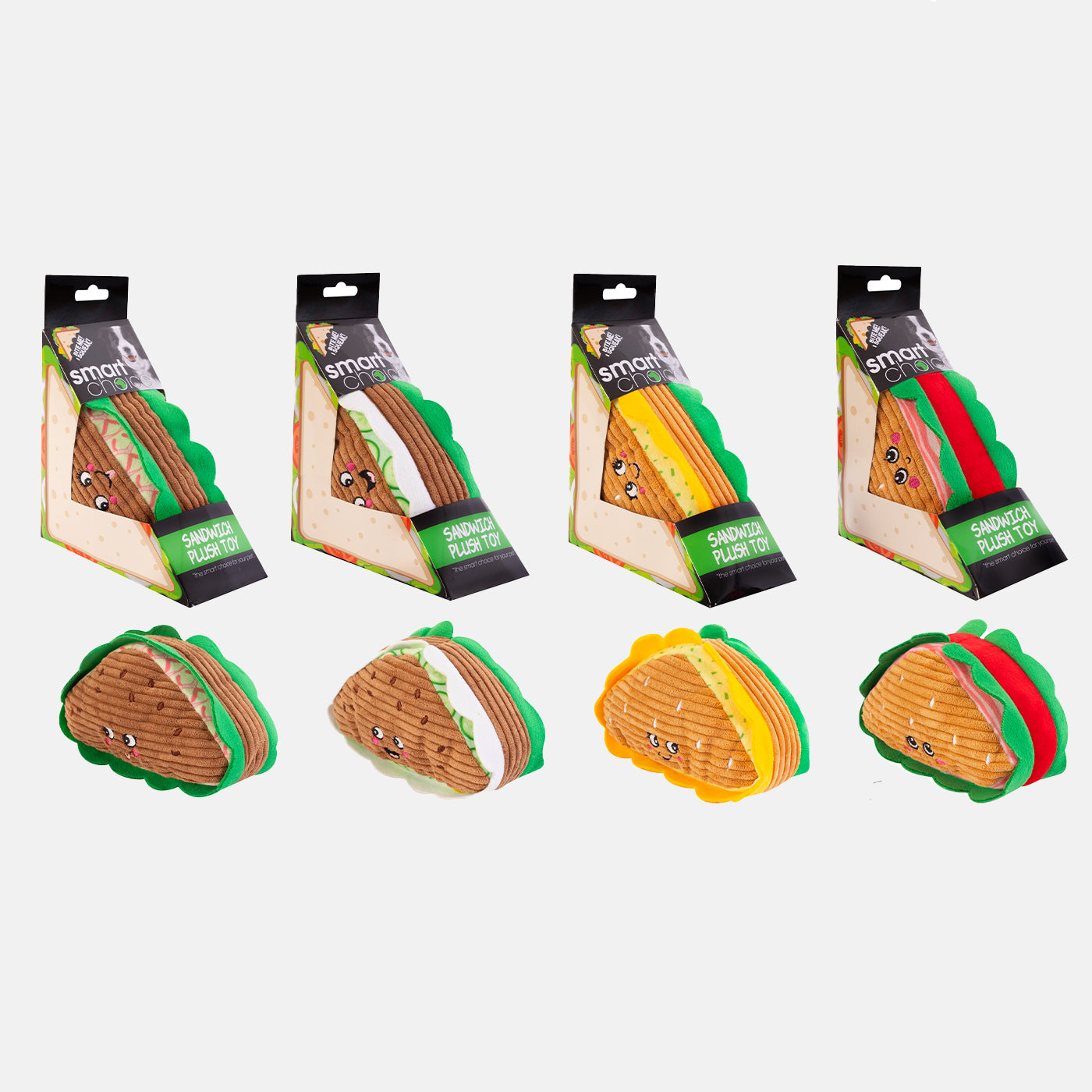 Your pup will love this Plush Sandwich Dog Toy! This cuddly toy features an engaging squeaker and an embroidered face that will bring hours of enjoyment to your dog. With four unique designs including ham, prawn, egg and cheese - your pet won't know which one they're getting until it's in their paws!