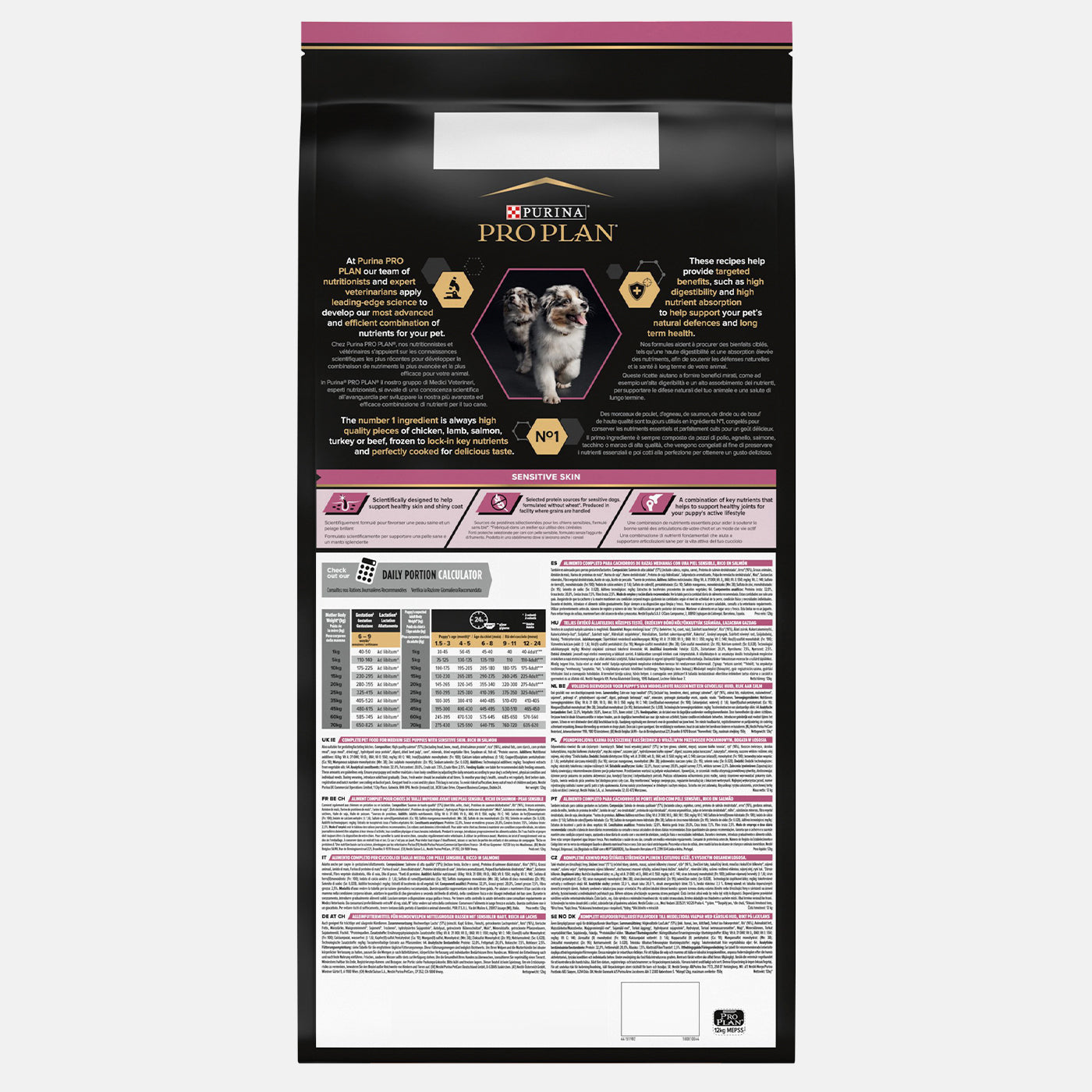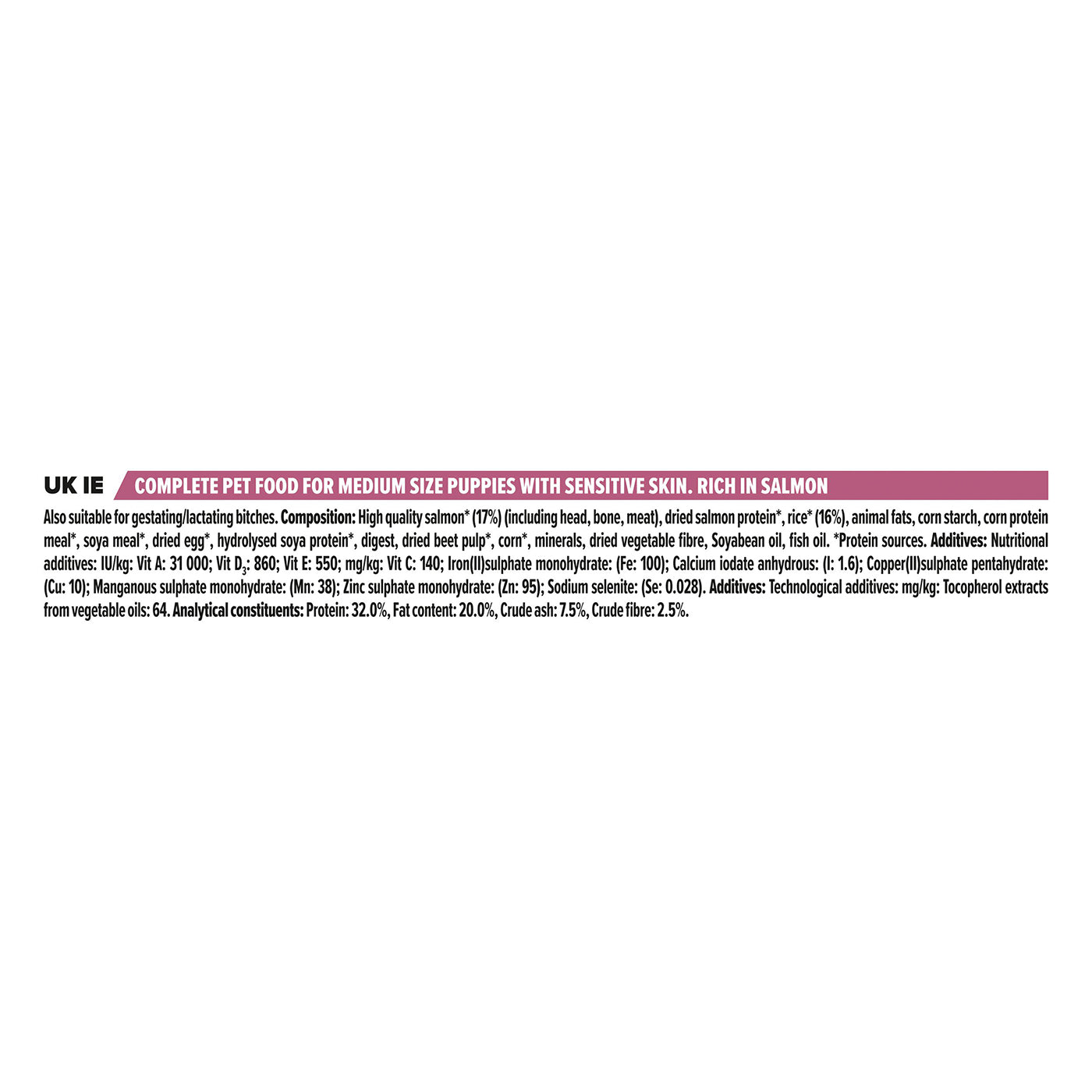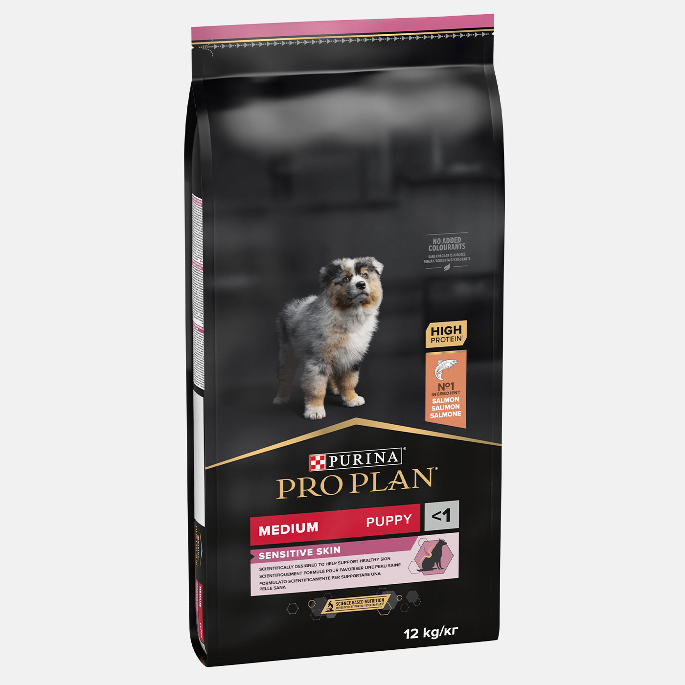 PRO PLAN Medium Puppy for Sensitive Skin with OPTIDERMA Salmon Dry Food 12KG is a complete and balanced dry dog food tailored for medium breed puppies. Clinically proven to improve skin health, this wheat and gluten free formula helps reduce potential skin reactions associated with food sensitivity and supports healthy joint growth.