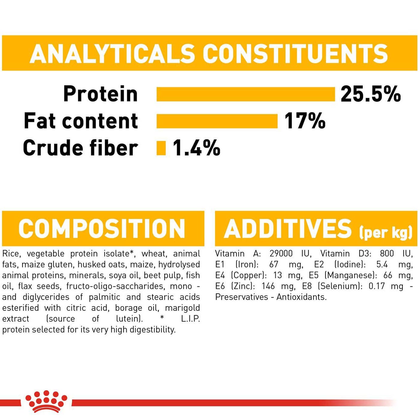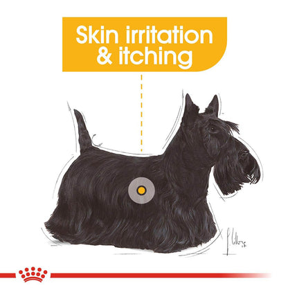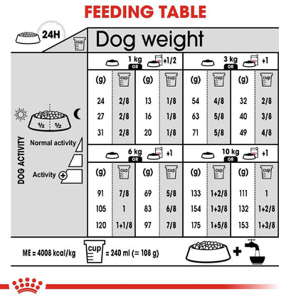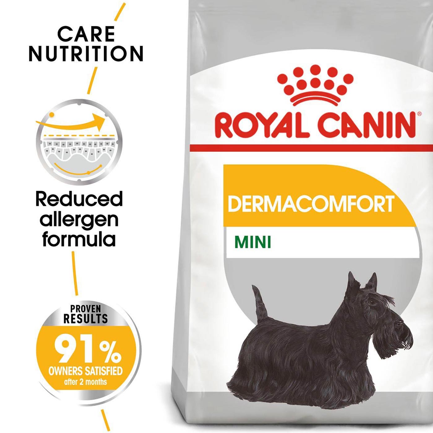 Itching and irritation is unpleasant for your dog and affects their comfort and wellbeing. Sensitive, itchy skin means a lot of scratching, which can lead to the skin becoming damaged. ROYAL CANIN Dermacomfort Mini's reduced allergen formula helps to support skin health by utilising a specifically selected range of very high quality proteins. What's more, it will also help to maintain your dog's healthy coat. ROYAL CANIN Dermacomfort Mini is also enriched with tailored combination of Omega 3 and 6 fatty acids from soy, borage, fish and flaxseed oils, to help support skin health and promote its natural barrier role. Don't just take our word for it, ROYAL CANIN Dermacomfort Mini's results are a proven success with 2 months exclusive feeding resulting in 91% of owners being satisfied with the results* ROYAL CANIN Dermacomfort is now available as dry kibble and loaf in pouch formats.  Providing complete and balanced nutrition when fed individually or in combination.  Please follow the feeding guidelines based on your dog's ideal adult bodyweight; mixed feeding and individual guides available. Suitable for adult small breed dogs (up to 10kgs) with a tendency to skin itching and irritation.