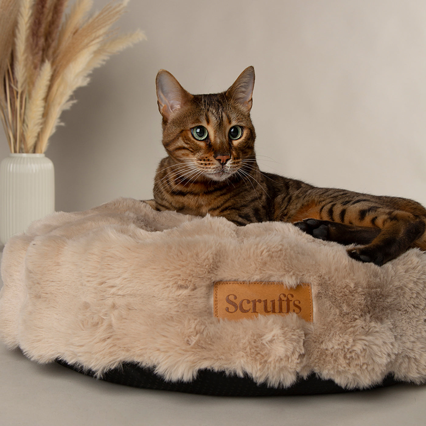Spoil your furry friend with the luxurious Scruffs Alpine Champagne Round Pet Cushion. Made with thick-cut faux fur, this neutral champagne cushion provides the ultimate sleep spot for your pet. The non-slip base ensures stability, while the 100% recycled fill makes it environmentally-friendly. Machine washable for easy maintenance. Ideal for cats and small dogs.