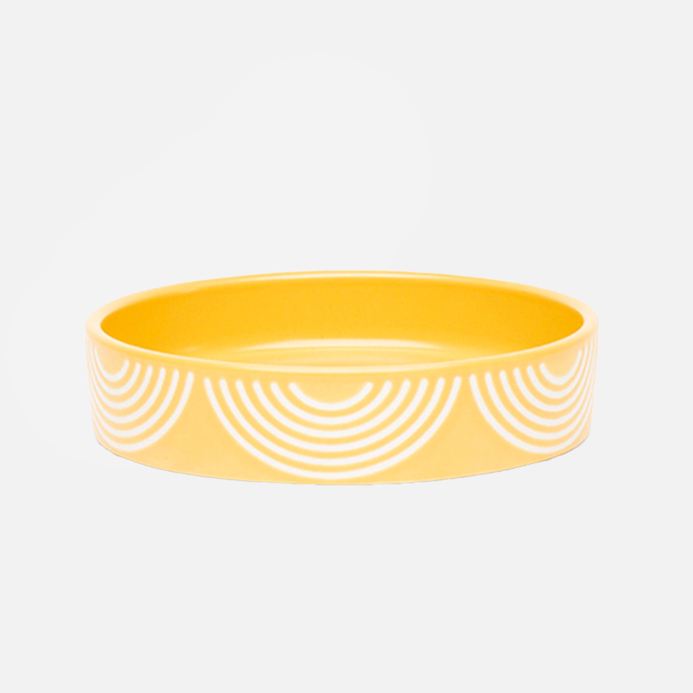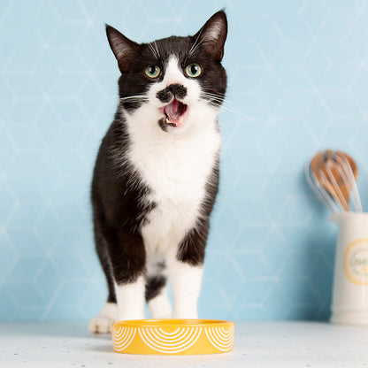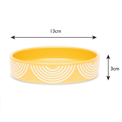 Enhance your pet's dining experience with our vibrant Sunflower Aztec Pet Saucer! Made with heavy duty ceramic stoneware, this saucer is not only dishwasher and microwave safe, but also shaped to hold larger capacities, preventing whisker fatigue. Give your pet the best with our beautifully patterned saucer.