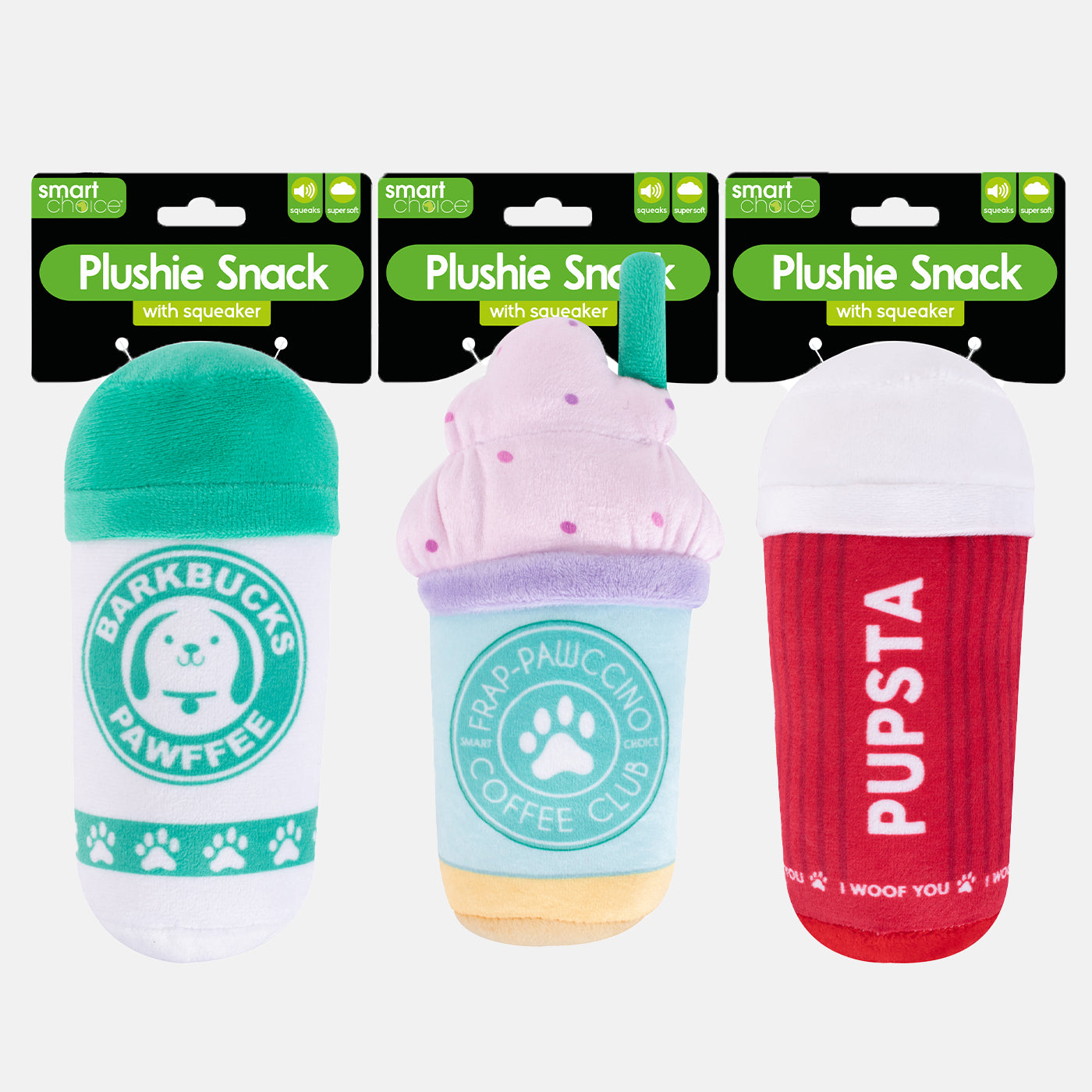 Surprise your pup with the Smart Choice Assorted Squeaky Coffee Plush Dog Toy! This purr-fect squeaky toy assortment will keep your pup entertained with it's internal squeaker! Made with super-soft polyester, making it perfect for puppies! Inspired by famous coffee with paw-some puns to make you chuckle! Treat yourself (and your pup) and get your caffeine fix today!