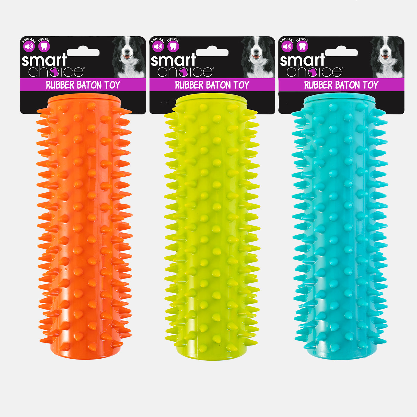 This lightweight, robust rubber dog baton is made of tough TPR rubber to ensure durability. The added squeaker entices play and the soft spikes help remove plaque and keep teeth clean. An ideal toy for any pup.