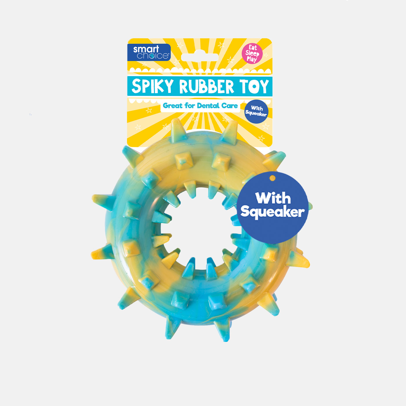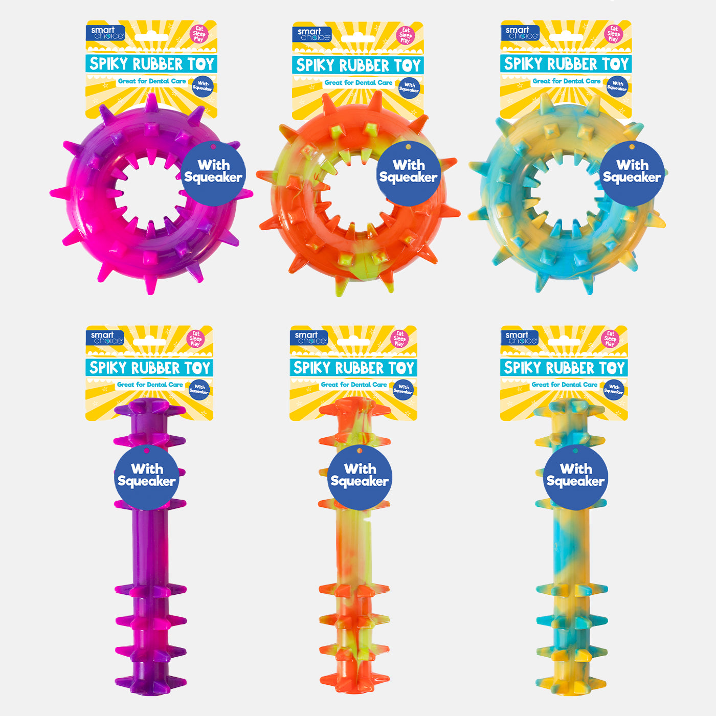 This lightweight, robust rubber dog baton is made of tough TPR rubber to ensure durability. The added squeaker entices play and the soft spikes help remove plaque and keep teeth clean. An ideal toy for any pup.