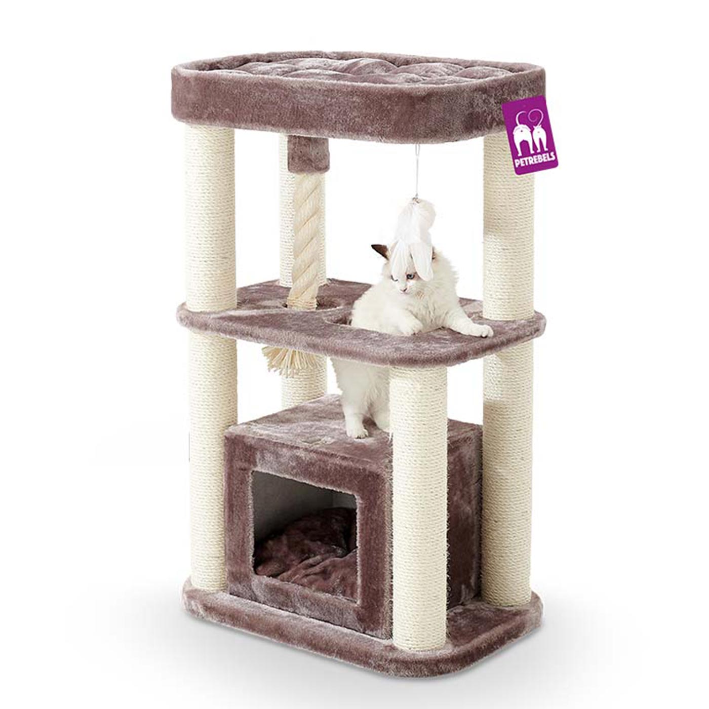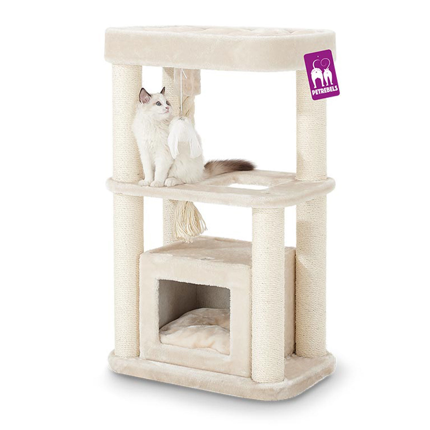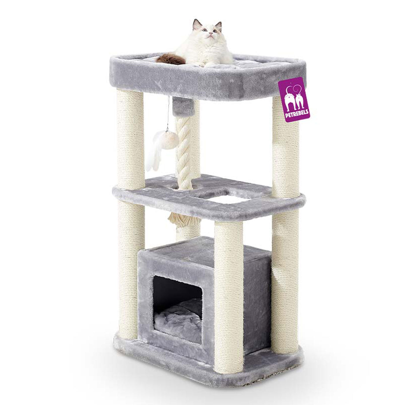 - Three levels and hanging toys for added fun