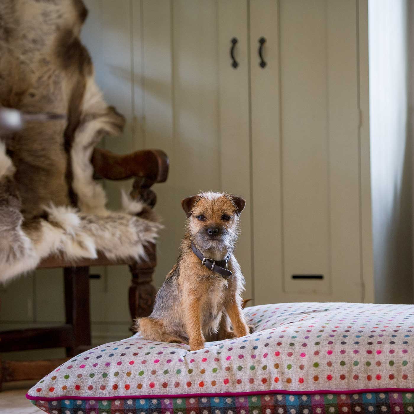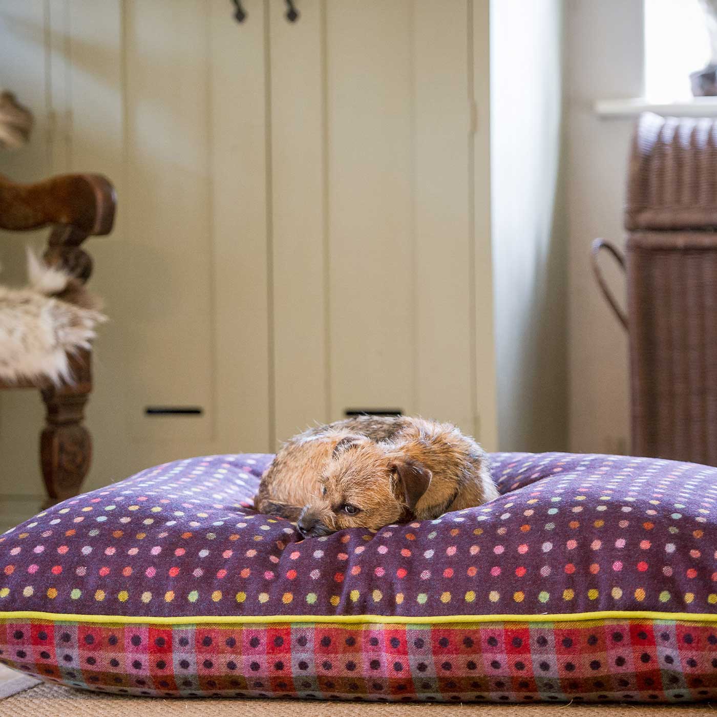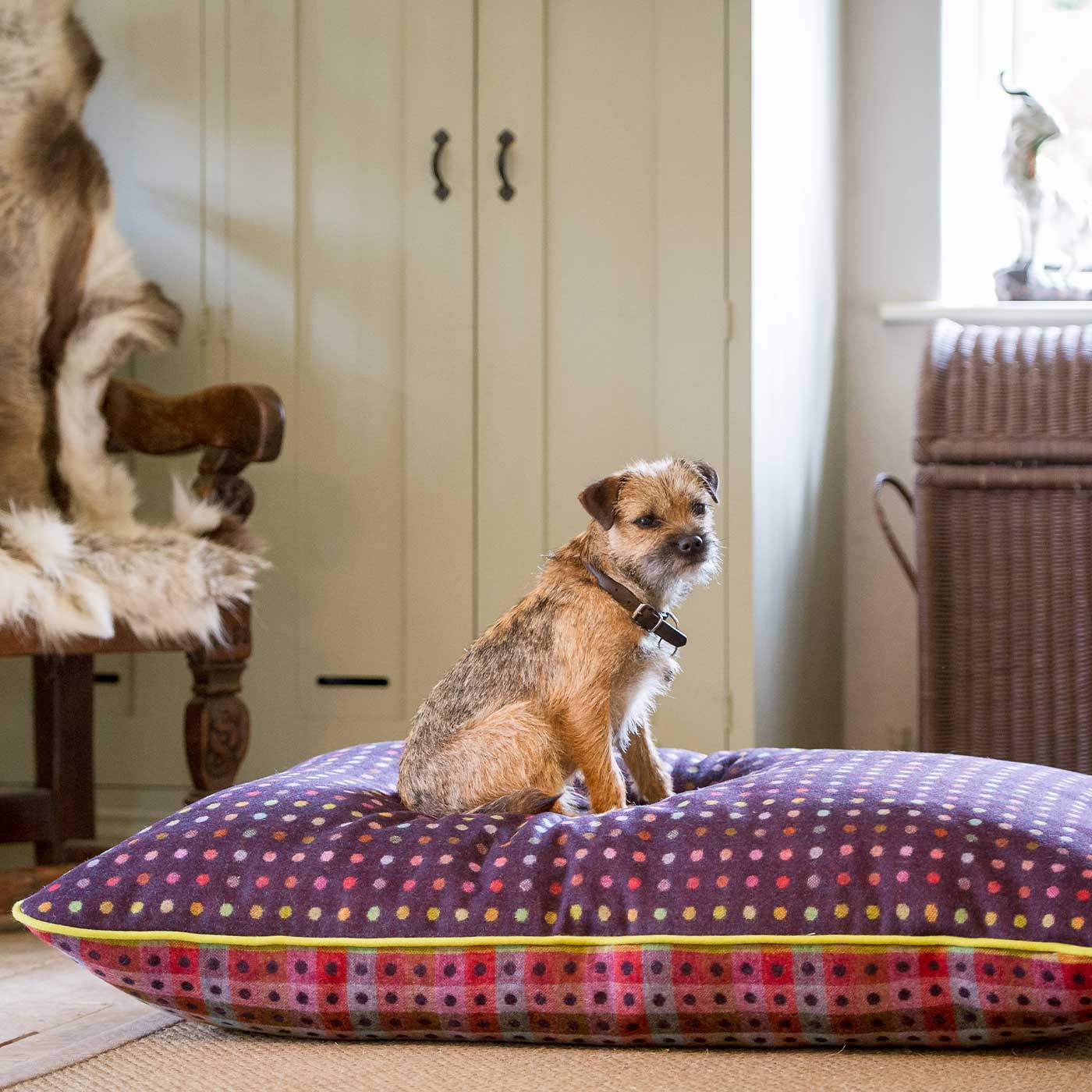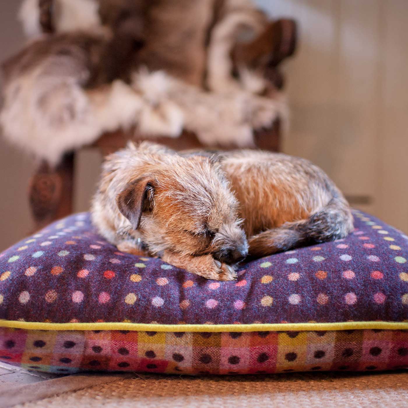 The Lounging Hound Multi Spot Wool Bed is the perfect bed for your pup's restful sleep. Featuring a fully reversible design with two spot patterns to choose from, the high-quality filling offers superior comfort. The removable cover has a concealed zip and is machine washable, crafted from 100% pure wool for a luxurious feel.