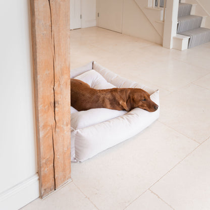Experience ultimate comfort with our Box Bed For Dogs In Velvet Oyster By Lords & Labradors. Deeply filled and featuring raised sides for a comfy head rest, this bed is perfect for post-walk, play, or bath naps. Available in 4 sizes and 8 beautiful colours, add a personal touch to your pup's perfect snooze spot.
